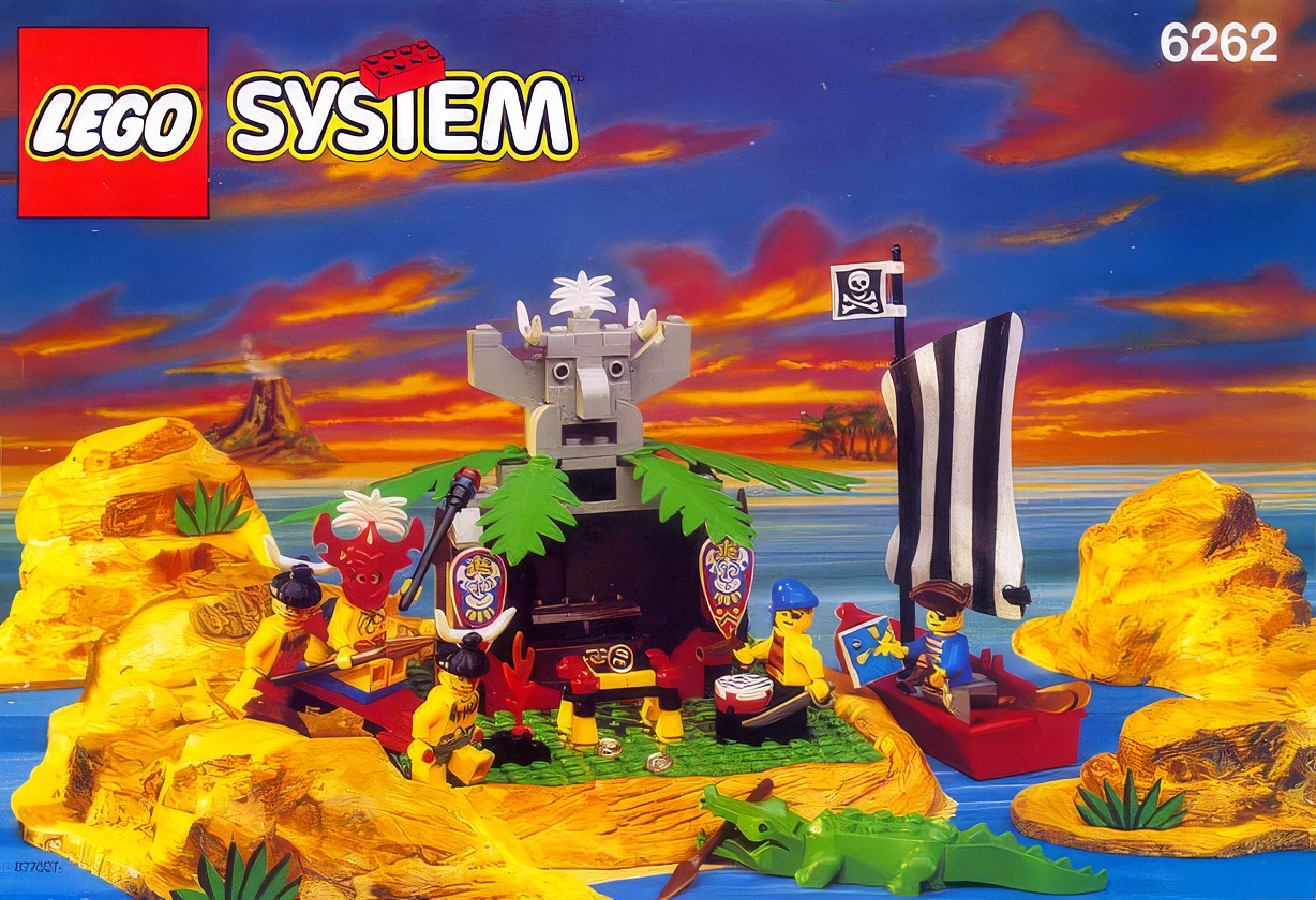 The piratical component of the playset is an overt homage to the 1992 set, 6261 Raft Raiders, utilising a brick sail in favour of cloth.