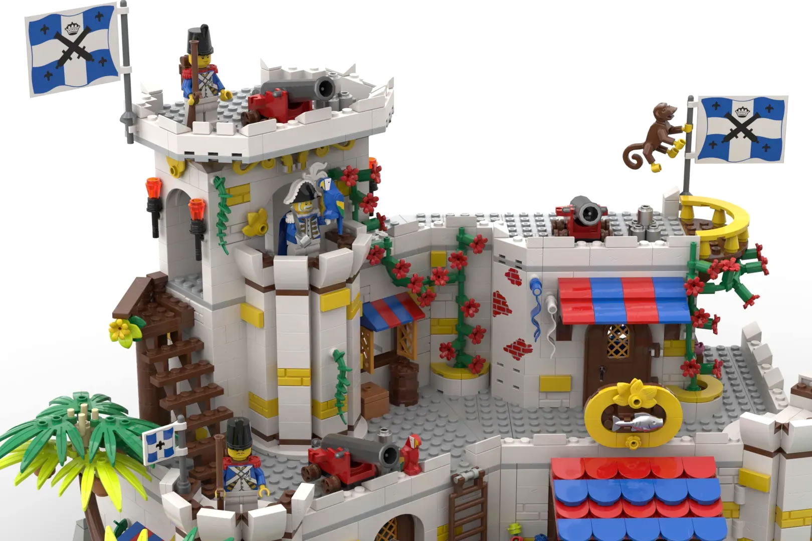 The spacious battlements mount three cannons, ensuring the fortress stands ready against any marauding pirates.