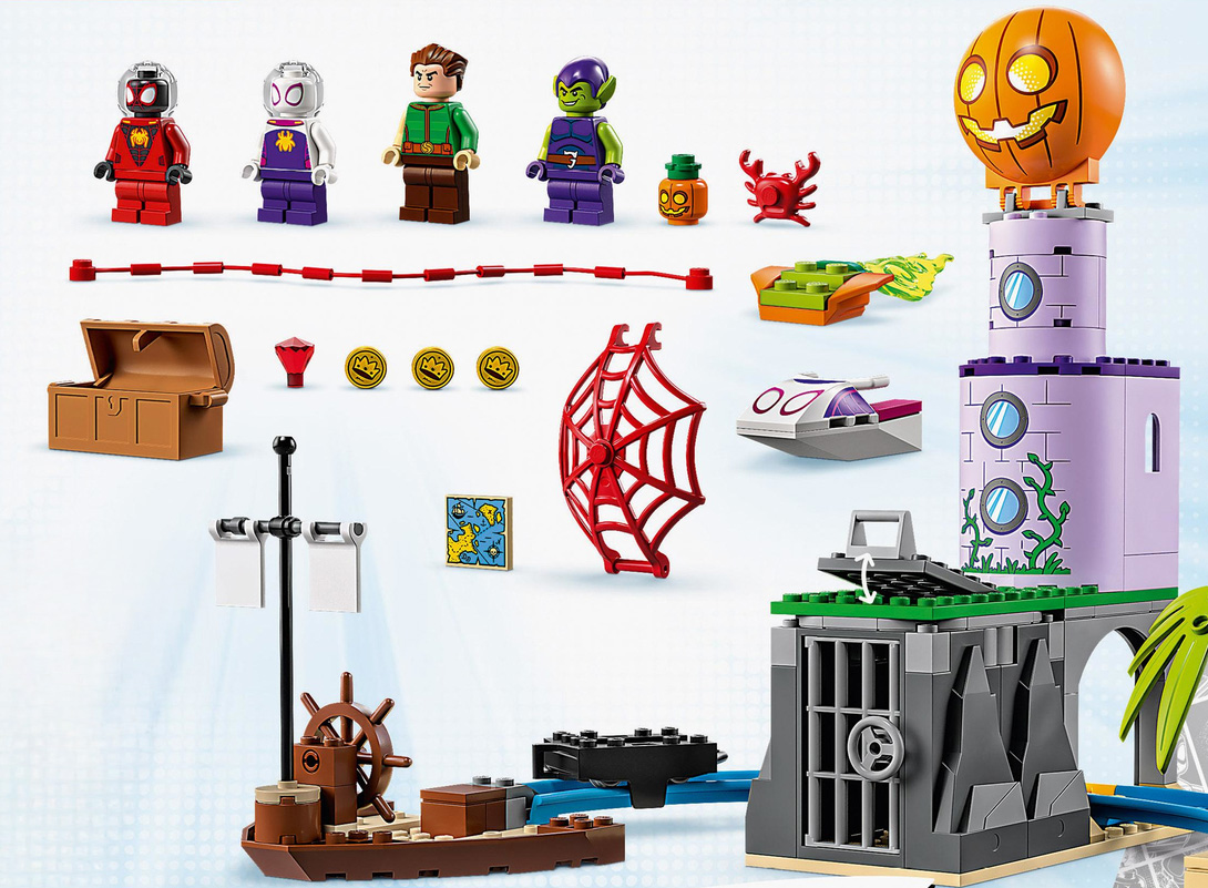 Plus a buildable pirate shipwreck, a railway to transport stolen treasure, a cave that doubles as a jail, the lighthouse headquarters of Green Goblin and numerous accessories.