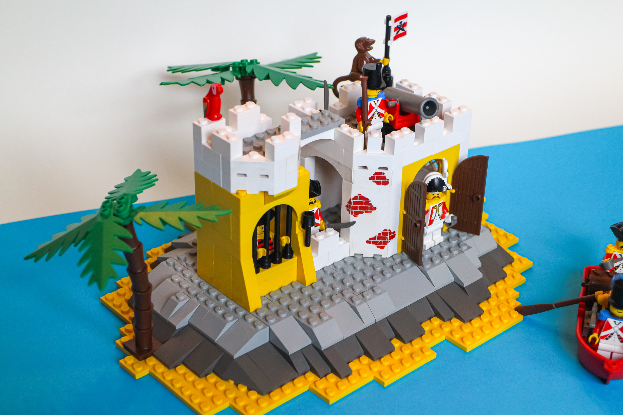 Aye, there be a large gun sitting atop the parapet, but unlike Cannon Cove, this artillery is peripheral, for the build does mould any framework around it… much to Admiral Woodhouse’s chagrin. And let’s not forgot the original-style palm trees with their glorious prehensile trunks, the trunks that fans desperately wish returned to official LEGO sets.