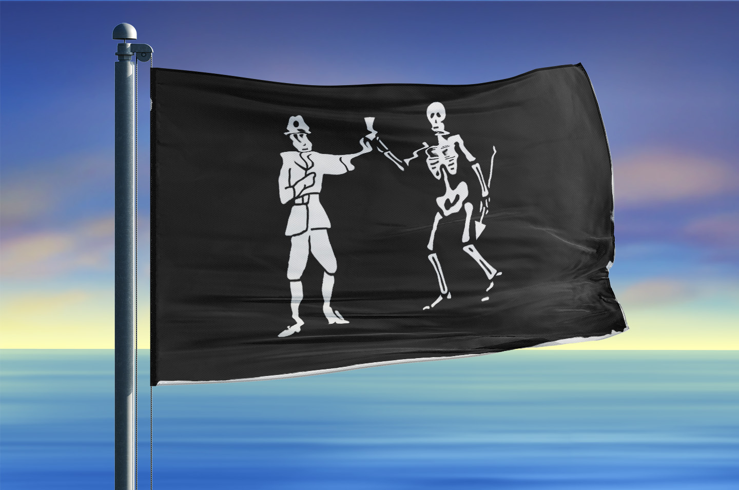 Though Black Bart never sailed under a letter of marque, his infamy was renown by a fearsome and unmistakable flag.
