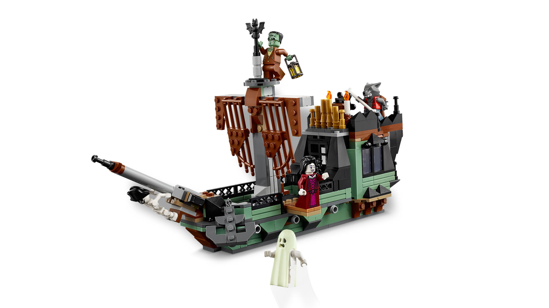 Crafted from the same pieces as the mansion, this eerie ship features skeletal details, tattered sails, creepy lanterns, and hidden surprises that evoke a cursed pirate legend…