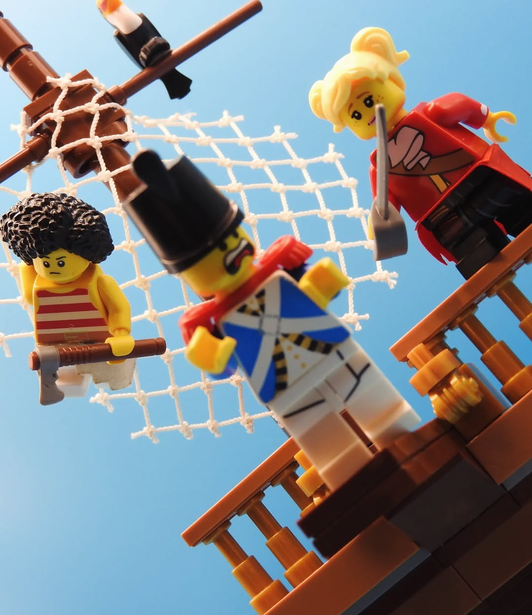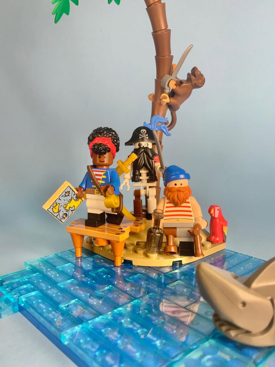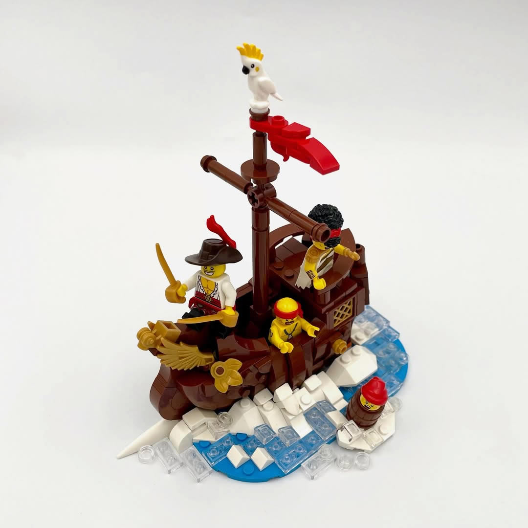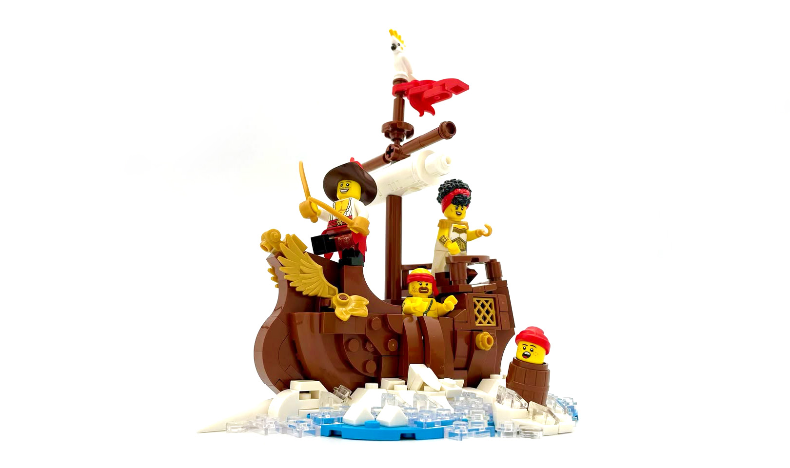 Tapping into the nostalgia of vintage LEGO Pirates, fuses a classic dinghy with flesh-tone minifigures of modern times.