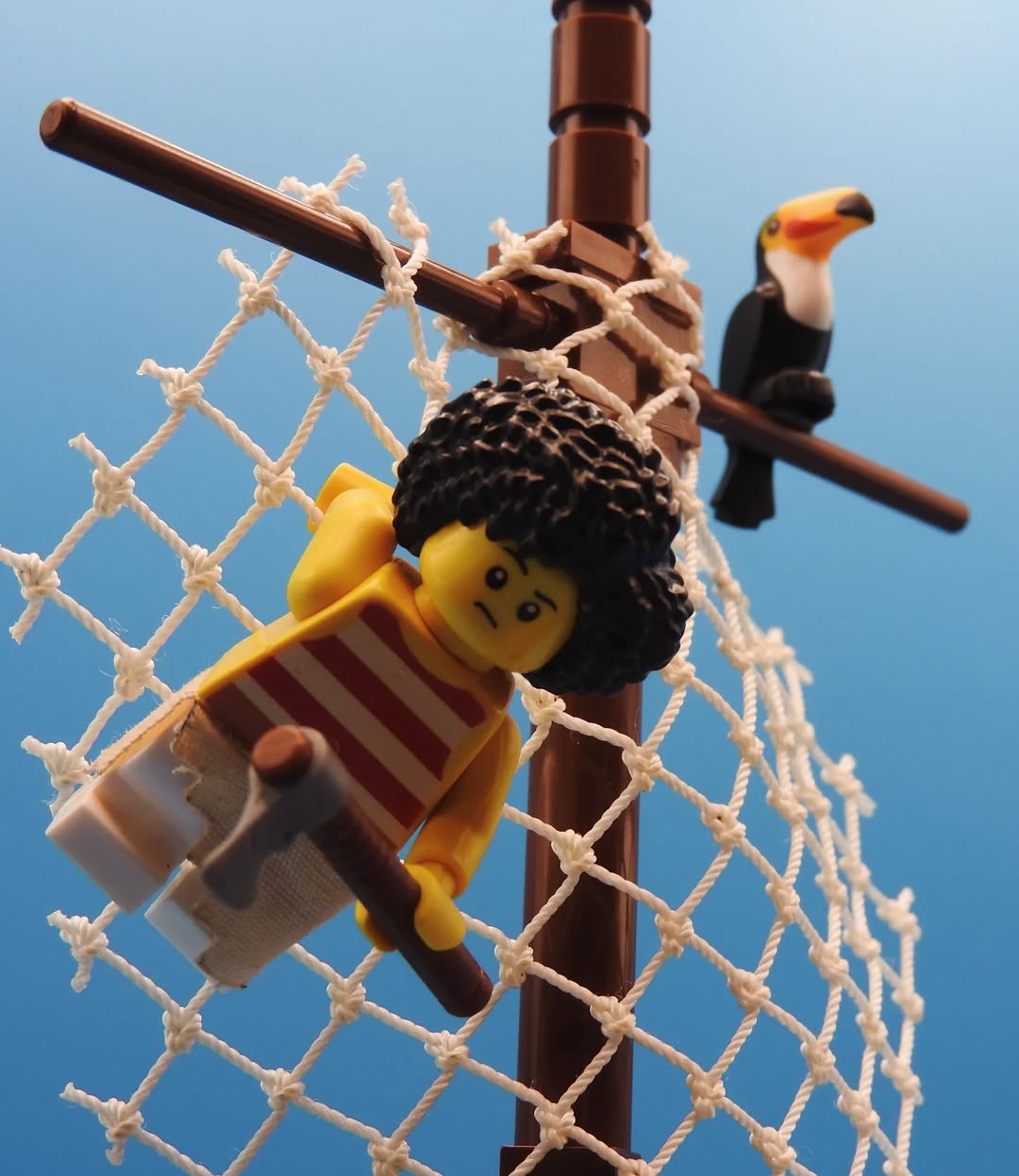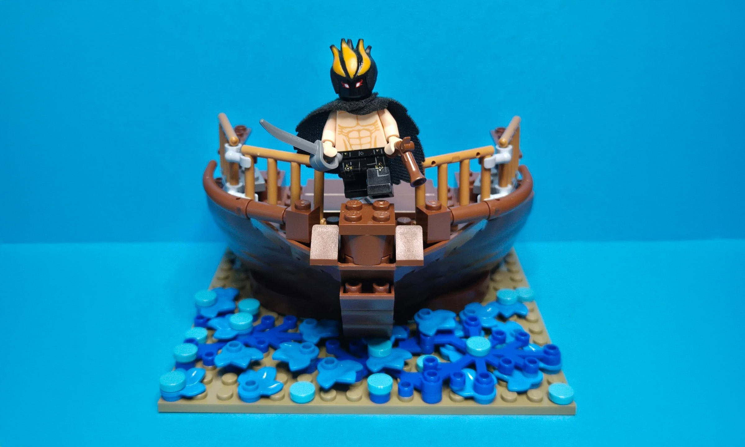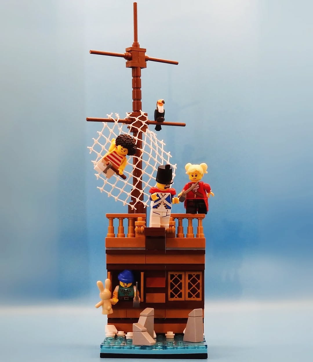 Tapping into the nostalgia of vintage LEGO Pirates, fuses a classic dinghy with flesh-tone minifigures of modern times.